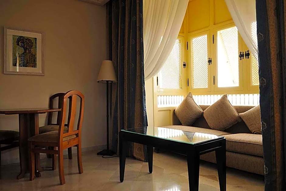 On-site dining options include ALCAZAR, a family-friendly, modern restaurant serving pizza, seafood, local, and international fare, and AL MANSOUR, offering Moroccan and local flavors in a traditional, romantic setting. A bar complements the meals, while free Wi-Fi, private parking, and a fitness center add convenient touches to the stay.
